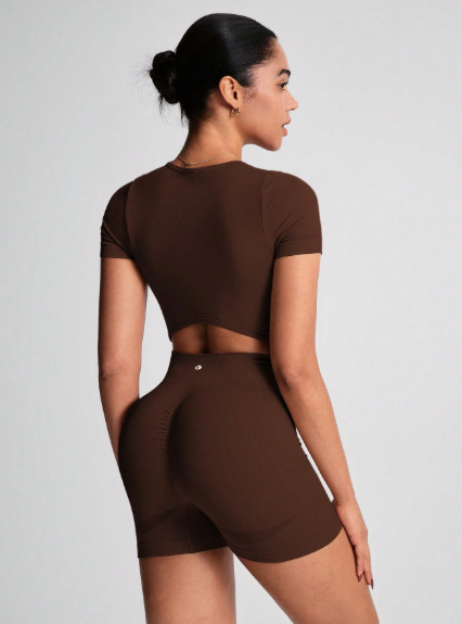 Conjunto deportivo y de yoga para mujer con top de manga corta de cuello redondo sin costuras y elástico, y shorts de ciclismo de cintura alta con control de abdomen