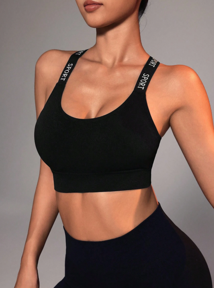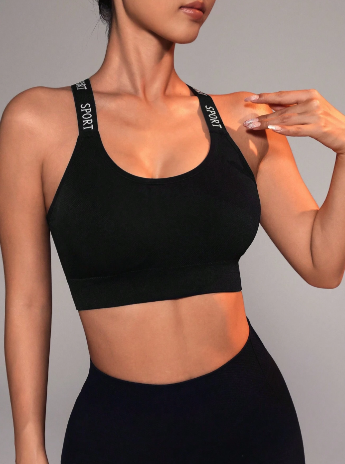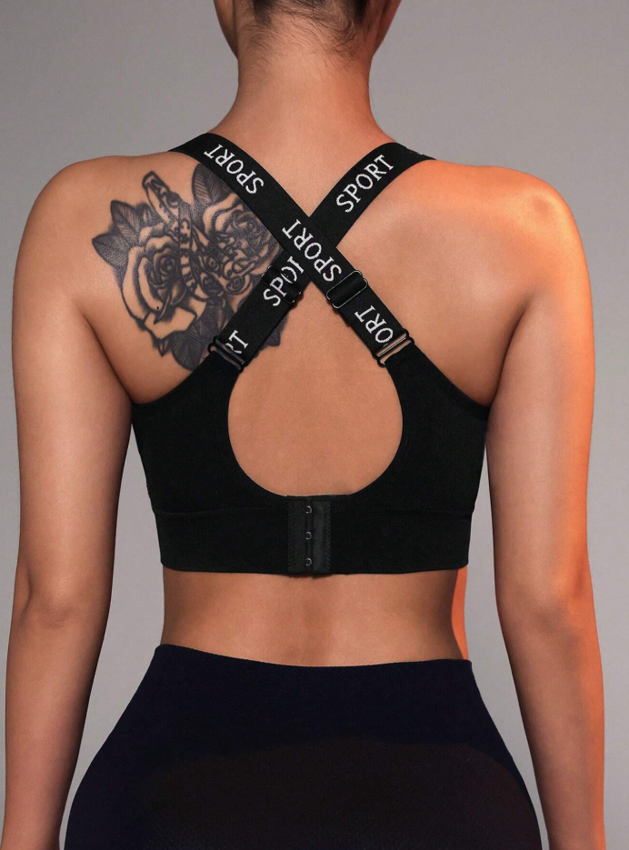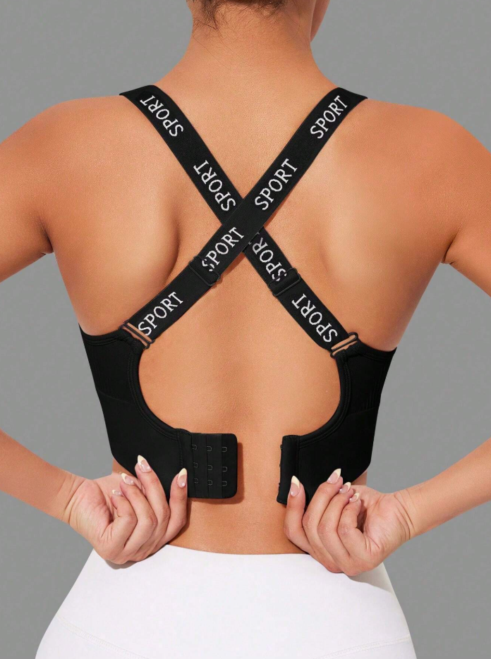 Sujetador deportivo con panel de cinta de letras y espalda entrecruzada